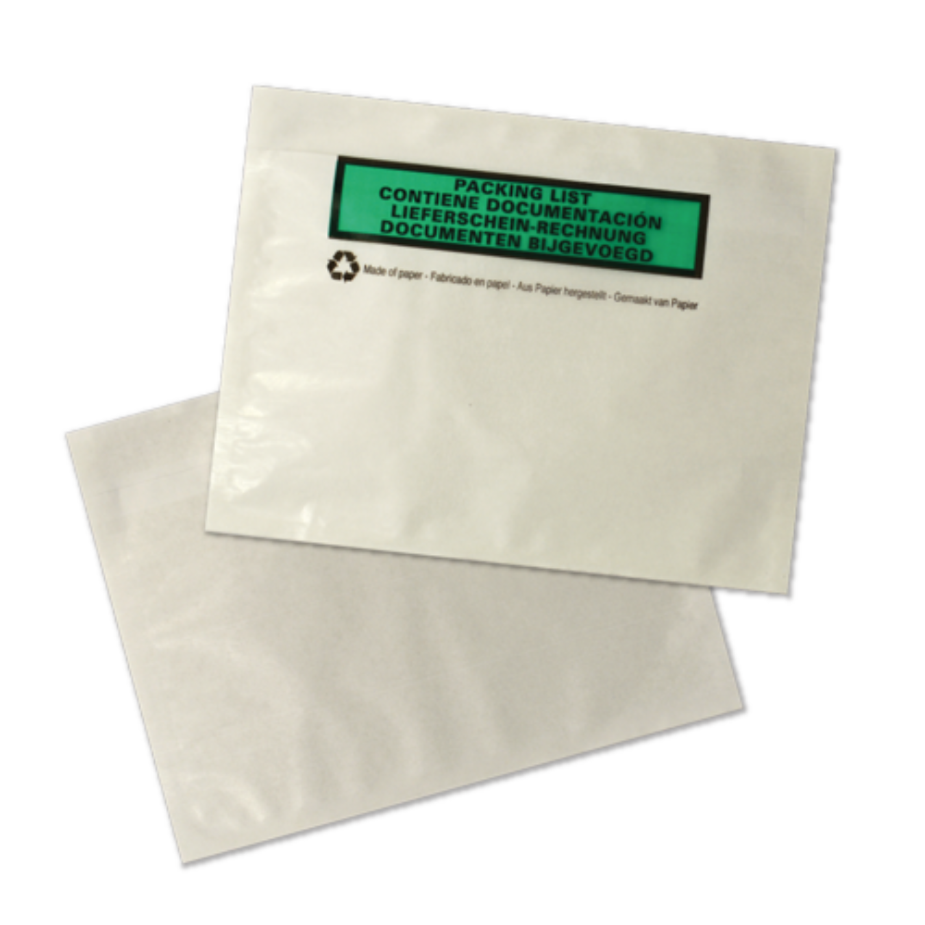 De 100% recycleerbare papieren paklijsten bestaan uit een transparante papieren bovenlaag en een volledige met een speciale lijm gecoate papieren onderlaag.